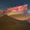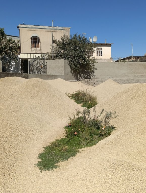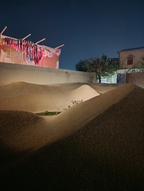 Это инсталляция о восприятии, расстоянии и тайных границах между реальным и воображаемым. Пространственная композиция состоит из двух массивных песчаных барханов, стоящих друг напротив друга, словно в диалоге или напряжённом молчании. Между ними — едва уловимая на расстоянии тонкая полоса жизни: узкий оазис, вытянутый, как запятая в длинной фразе пустыни.