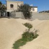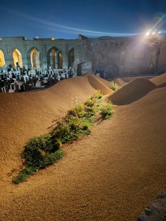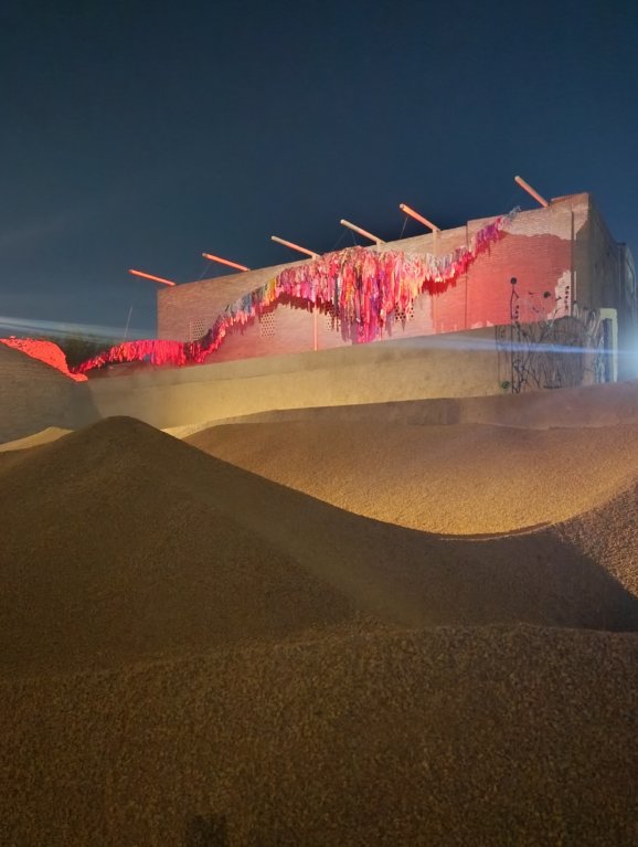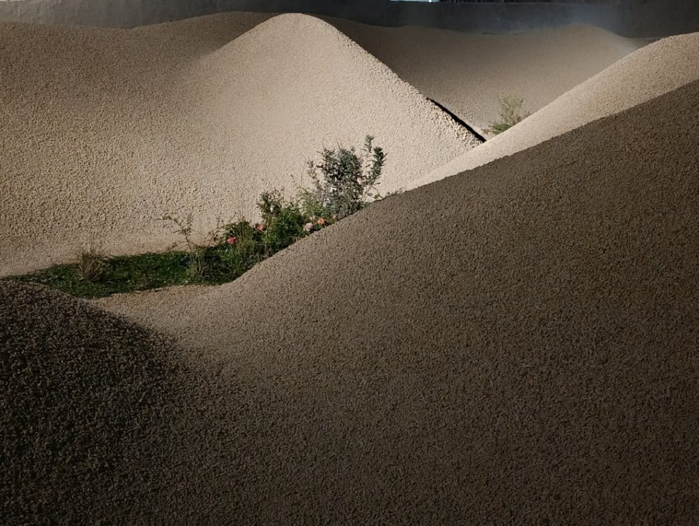 Это инсталляция о восприятии, расстоянии и тайных границах между реальным и воображаемым. Пространственная композиция состоит из двух массивных песчаных барханов, стоящих друг напротив друга, словно в диалоге или напряжённом молчании. Между ними — едва уловимая на расстоянии тонкая полоса жизни: узкий оазис, вытянутый, как запятая в длинной фразе пустыни.